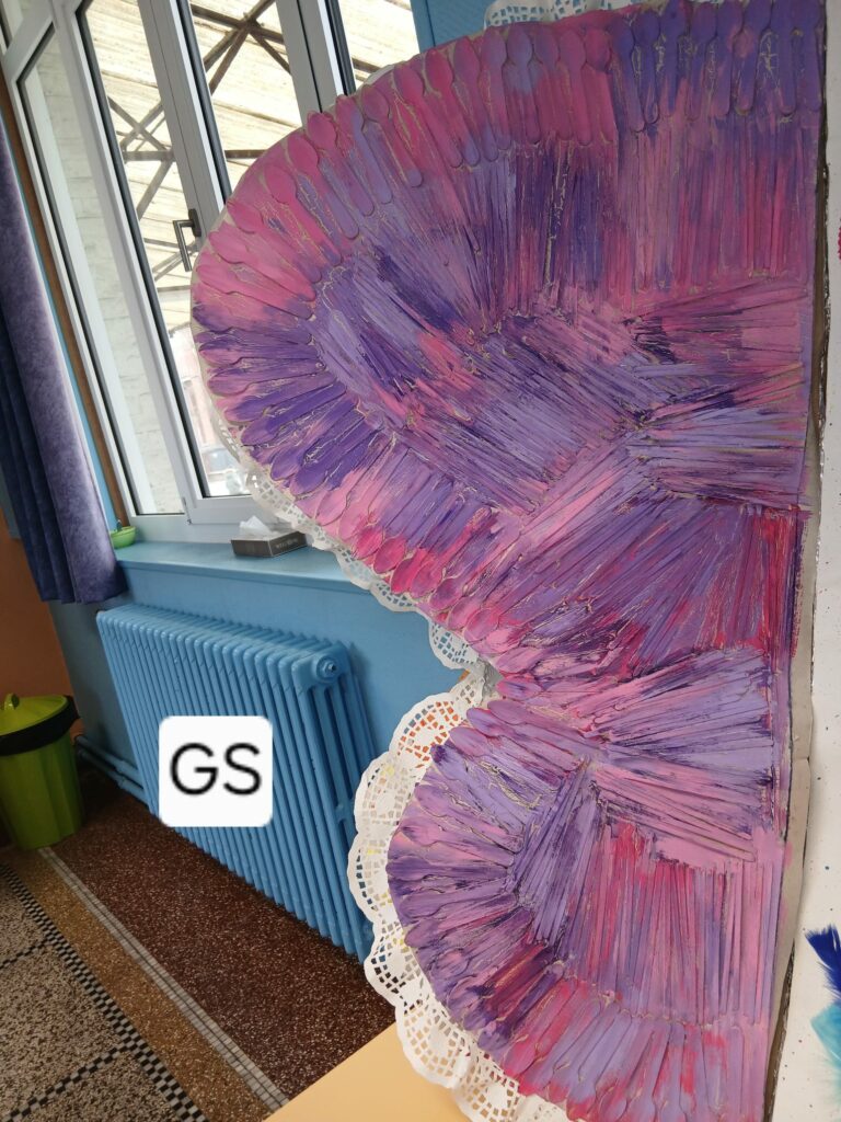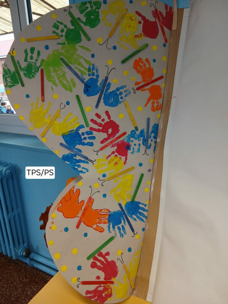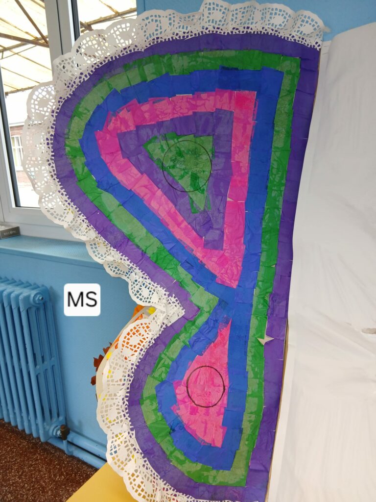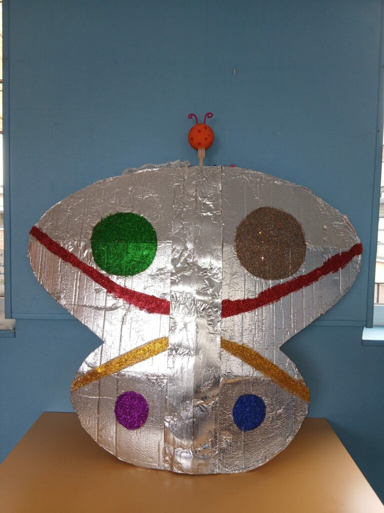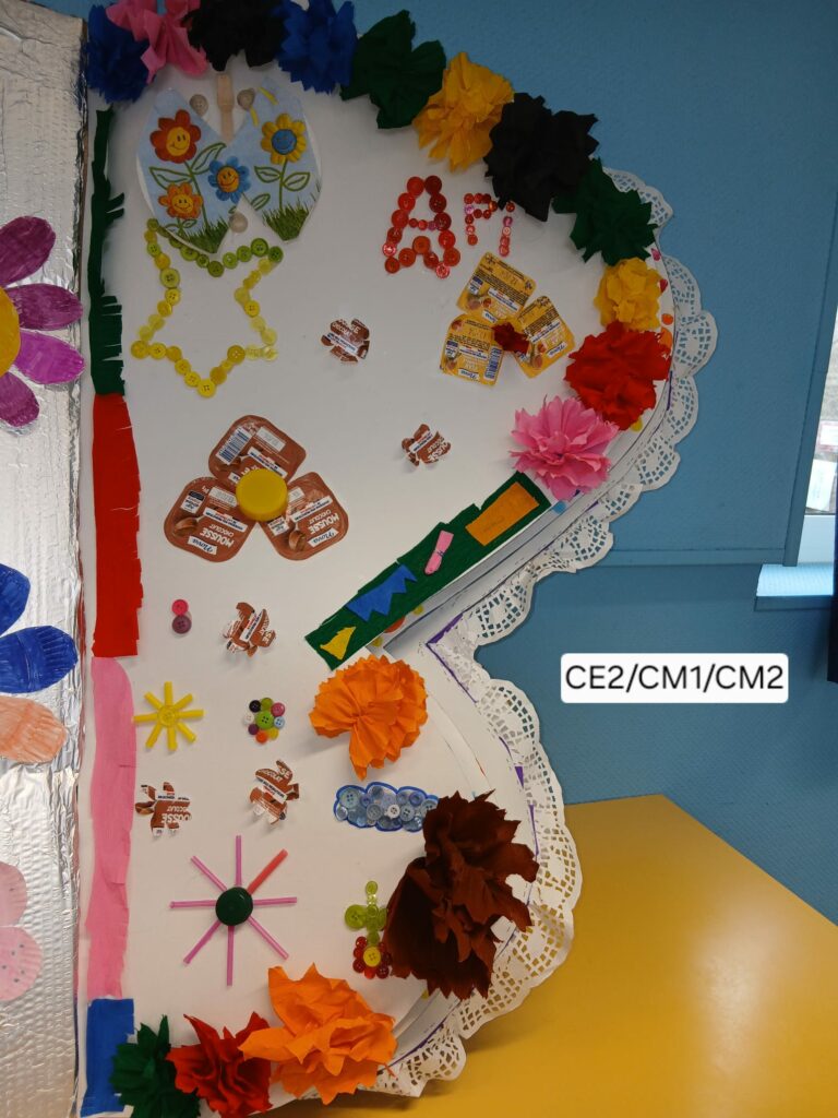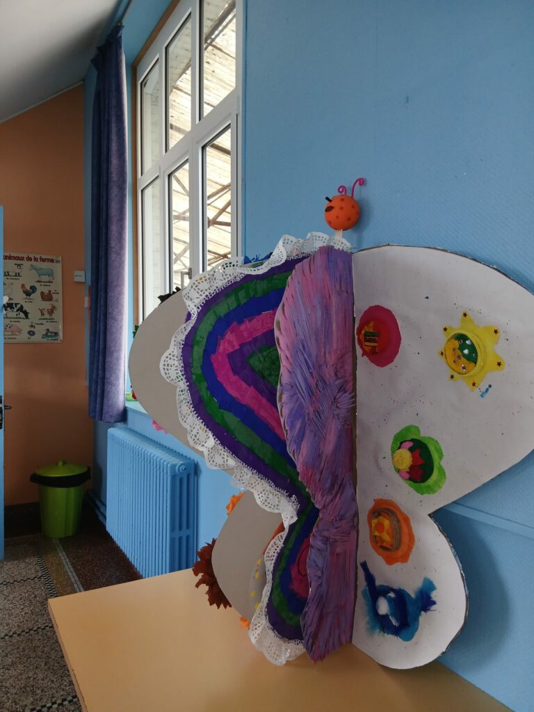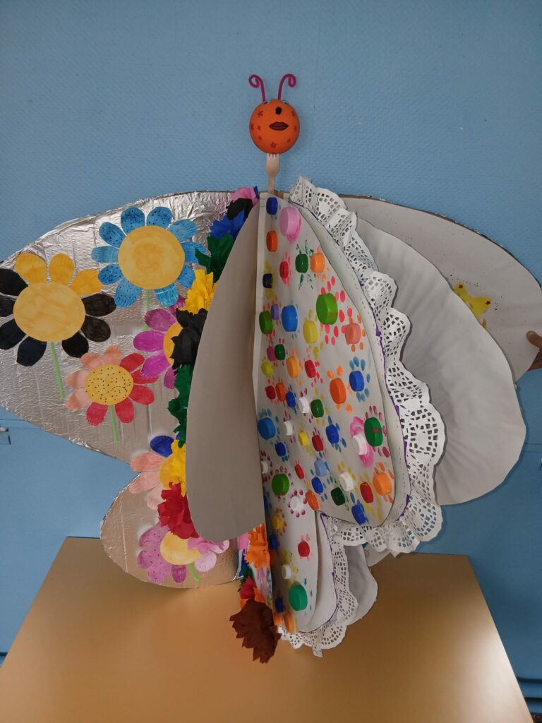 Un magnifique papillon a été imaginé et réalisé par les enfants autour du thème du recyclage. Conçu comme un livre ouvert, ses ailes prennent la forme de pages décorées par chaque groupe :