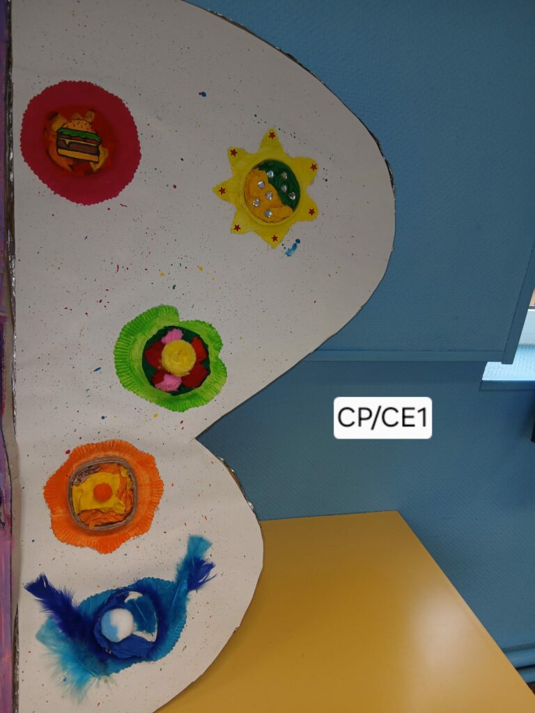 Les enfants ont fait preuve d’une belle créativité en utilisant des matériaux recyclés issus de la cantine : bouchons, emballages, papier, aluminium…