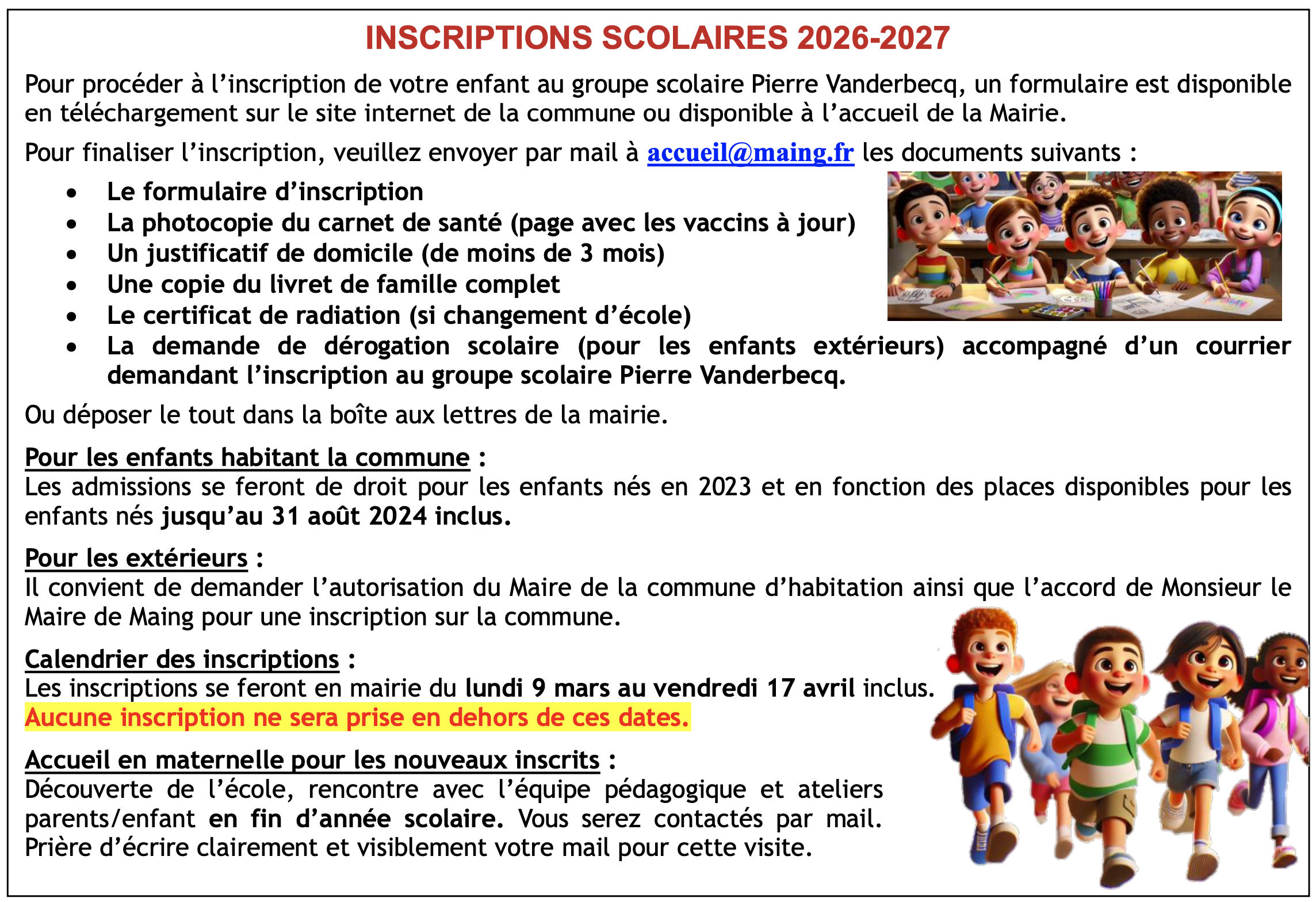 • Par courrier à l’adresse suivante : Mairie de Maing, rue Jean Jaurès, 59233 Maing à l’intention du Délégué à la Protection des données